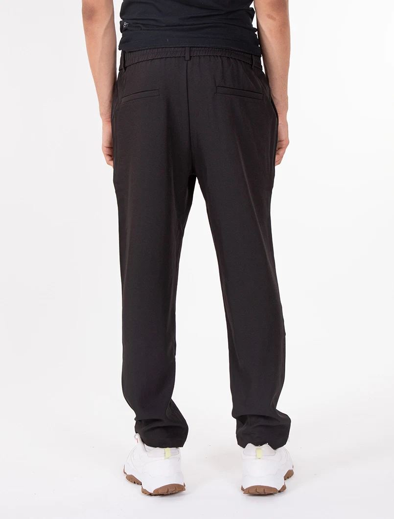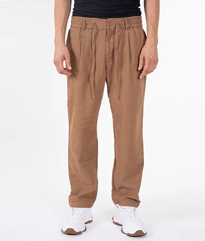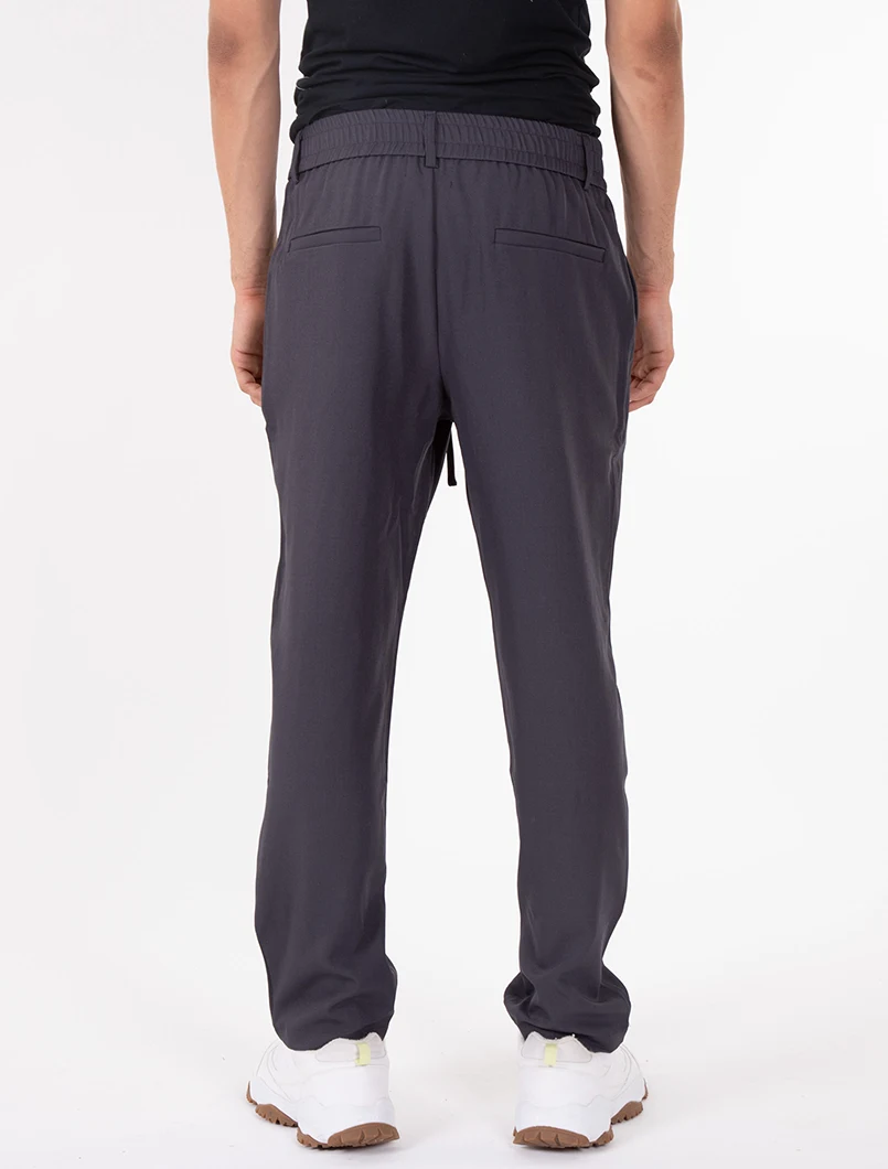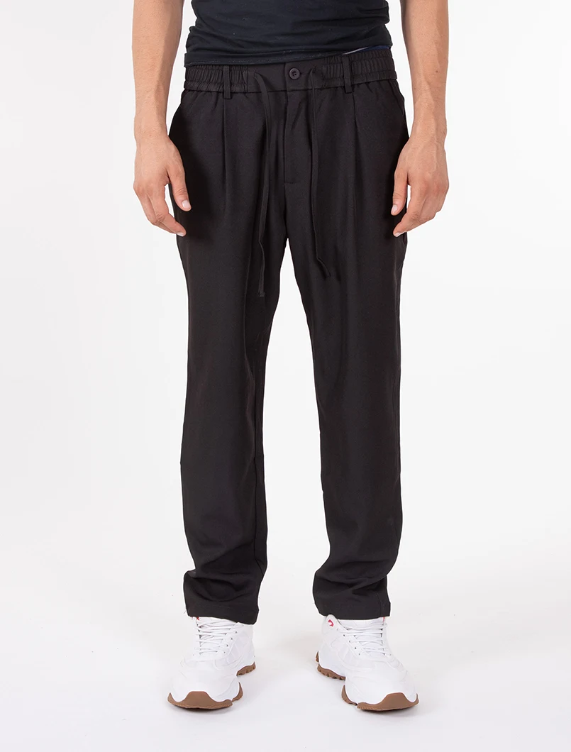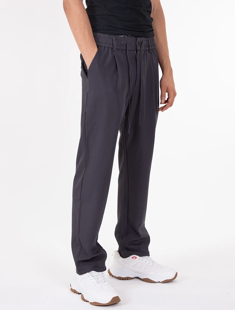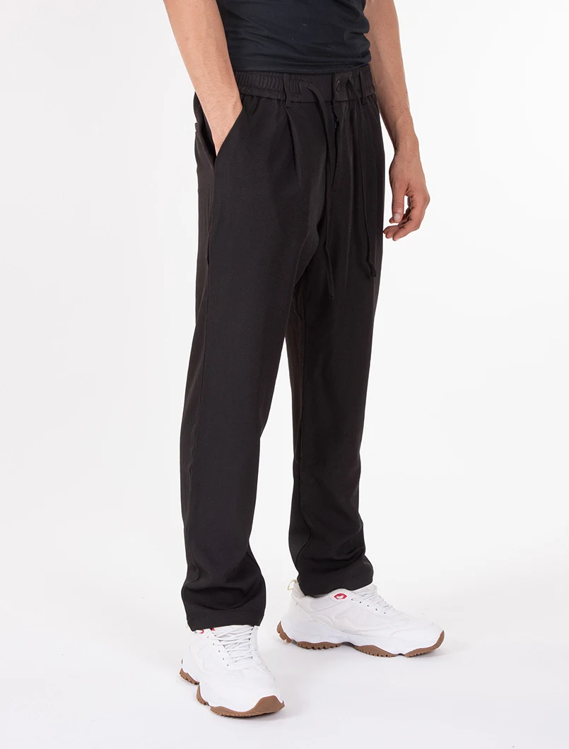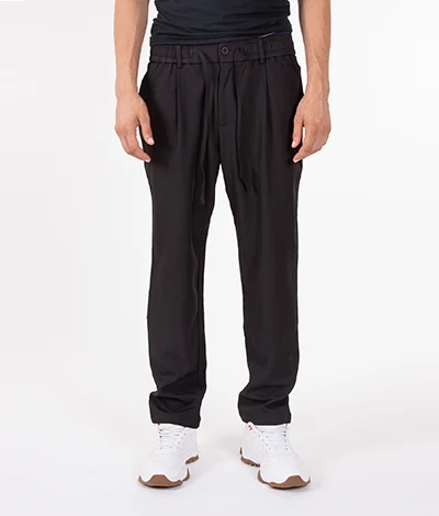 Pantalaccio elasticizzato con elastico in vita, bottone di chiusura e coulisse. Vestibilità comfort con pences.