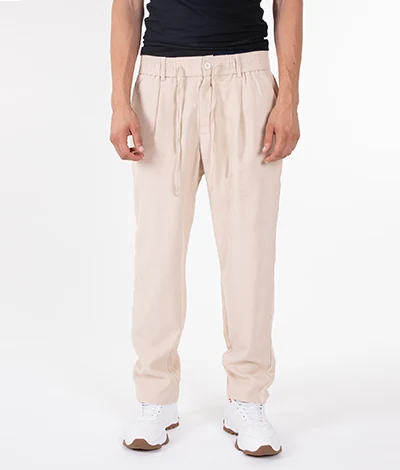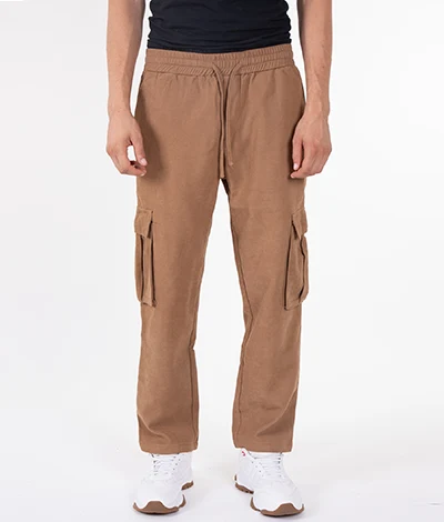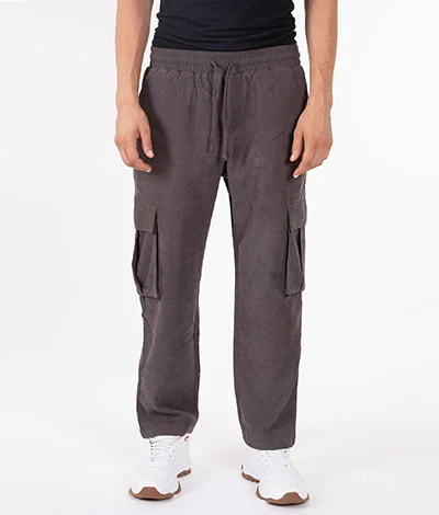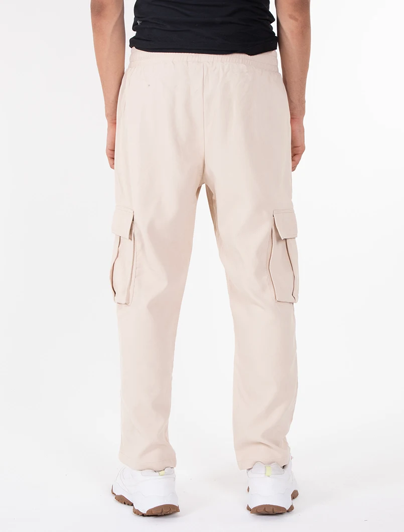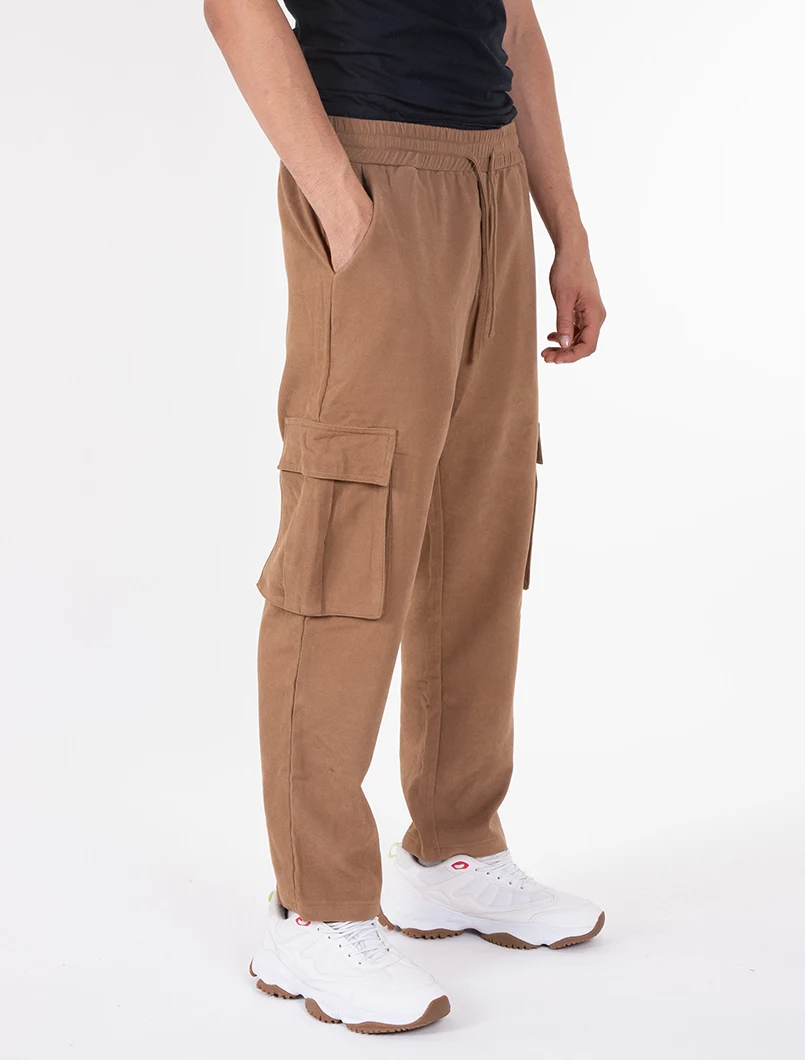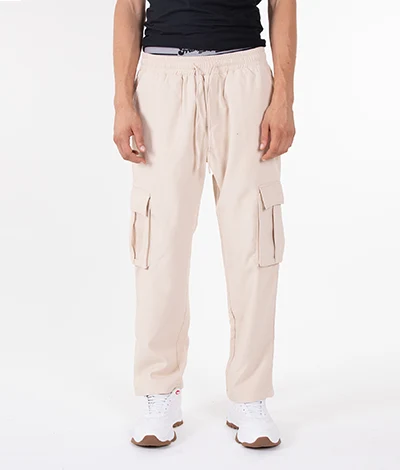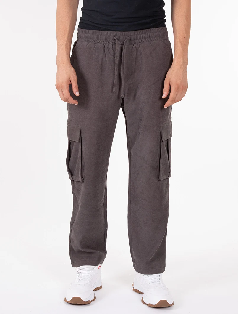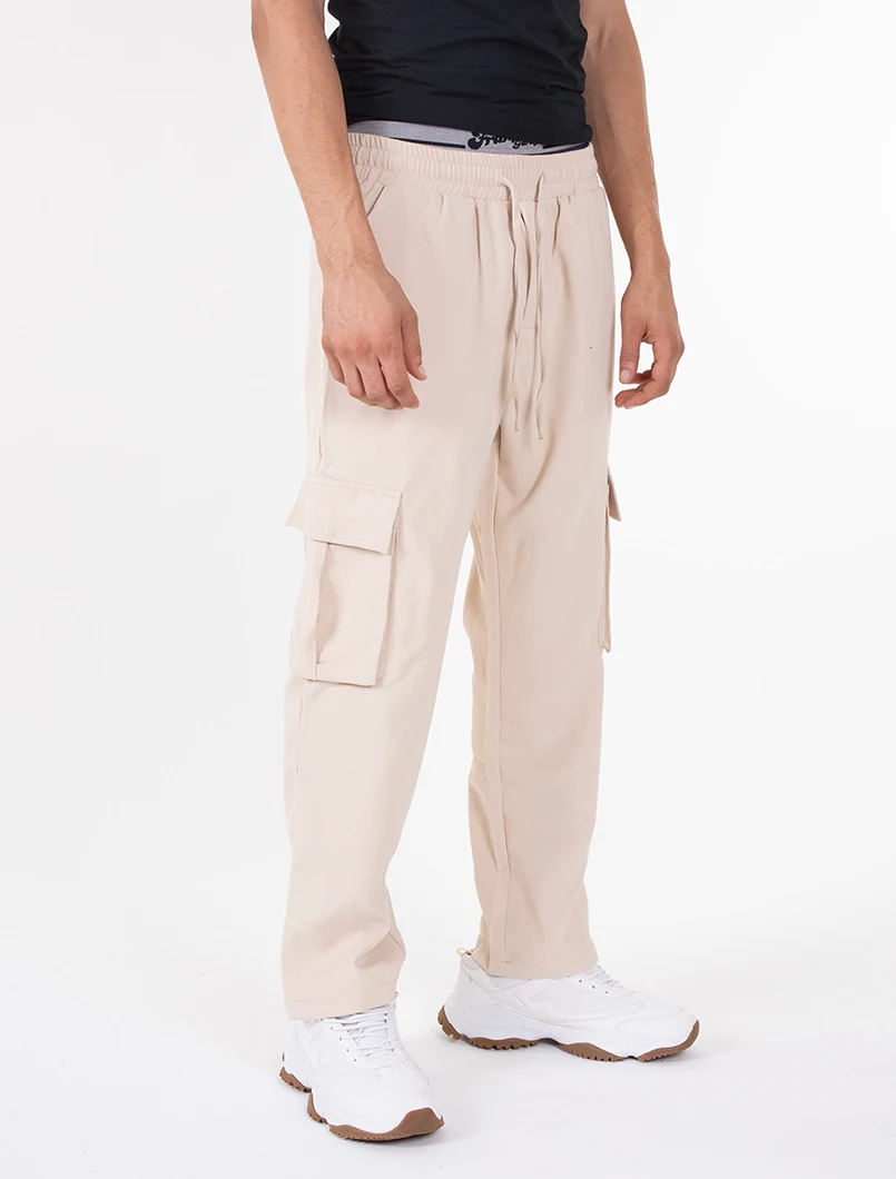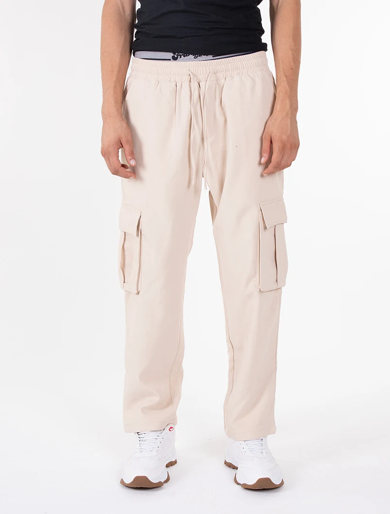 Pantalaccio con elastico in vita e coulisse. Tasconi cargo sulle gambe.