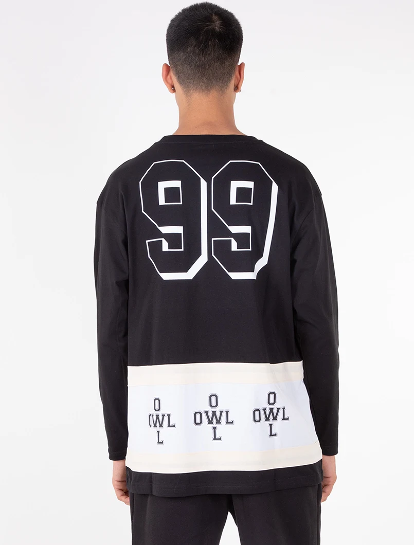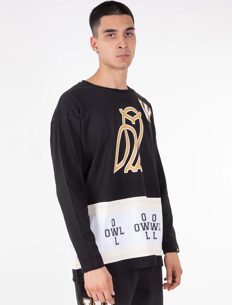 T-SHIRT manica lunga in cotone 100% con vestibilità Oversize e doppio tessuto a contrasto. Stampa su petto e schiena.