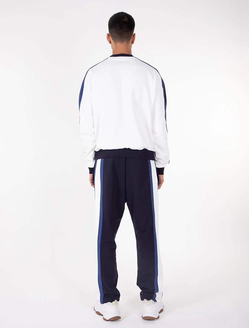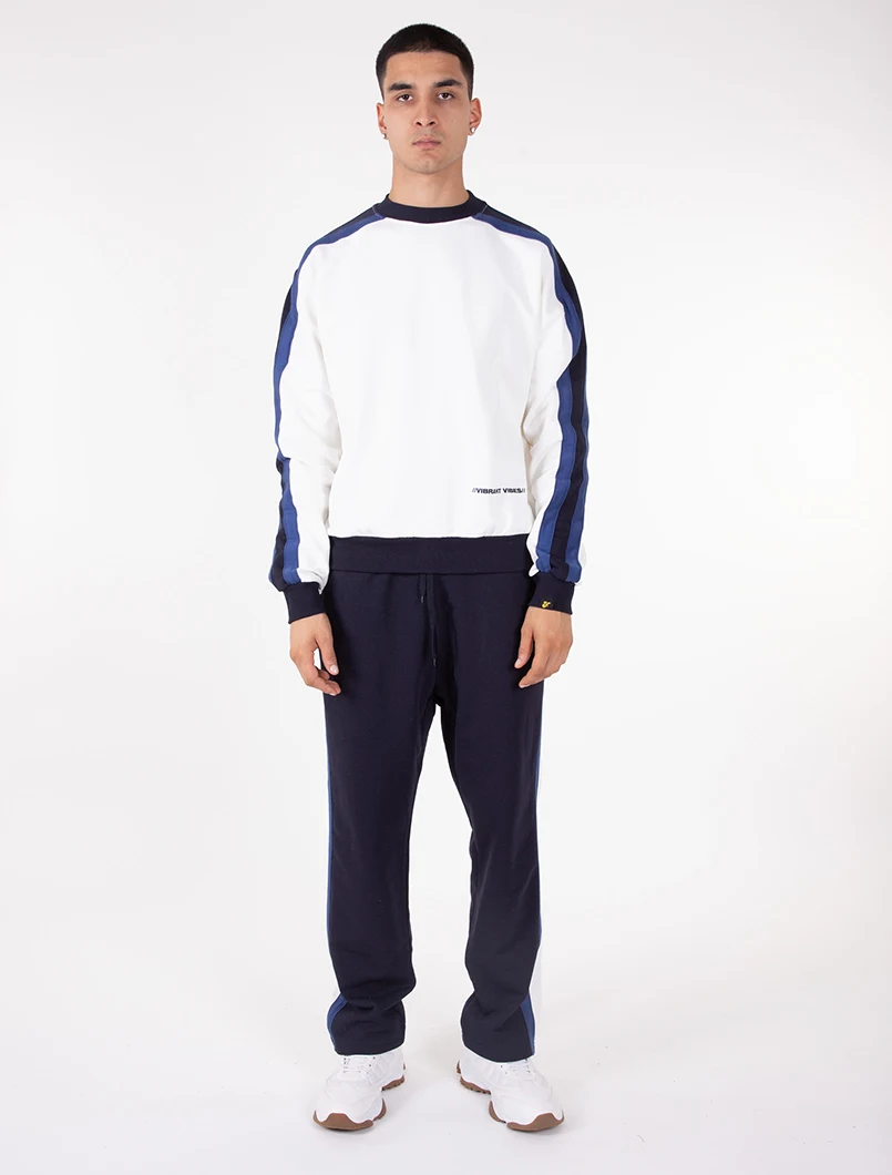 Felpa girocollo dalla vestibilità Oversize. Realizzata in tessuto garzato con applicazione di doppia banda a contrasto su entrambe le maniche.