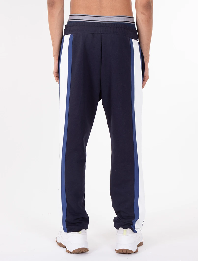 Pantalone tuta Relaxed-Fit, realizzato in tessuto garzato e con l'applicazione di una doppia banda a contrasto, sovrapposta su entrambe le gambe.